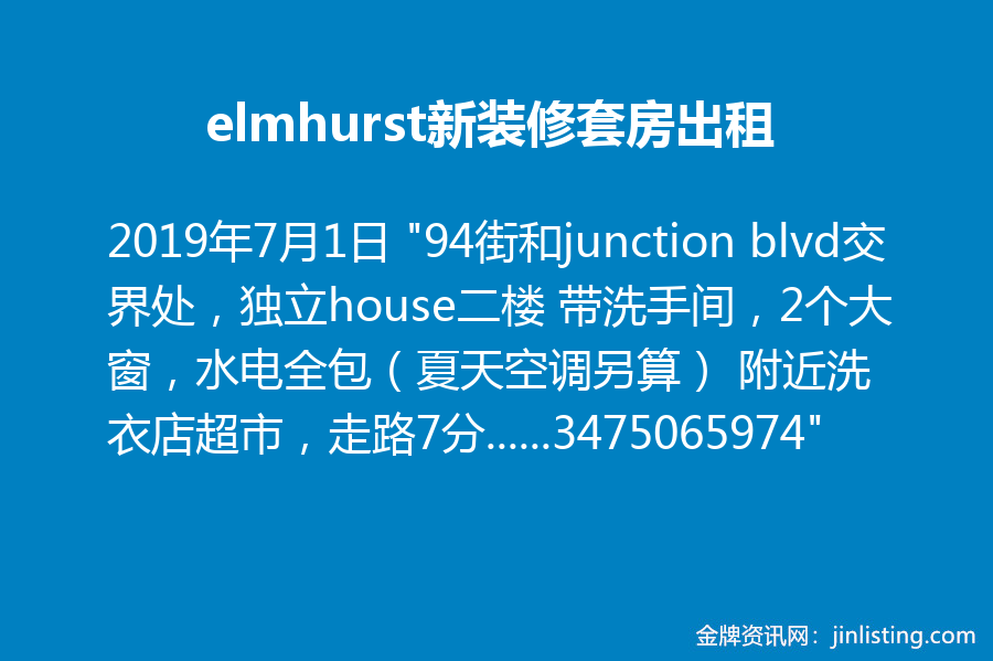 elmhurst新装修套房出租 “94街和junction blvd交界处,独立house二楼 带洗手间,2个大窗,水电全包(夏天空调另算) 附近洗衣店超市,走路7分钟到地铁站, 适合学生或正职人士。 看房请电:3475065974”