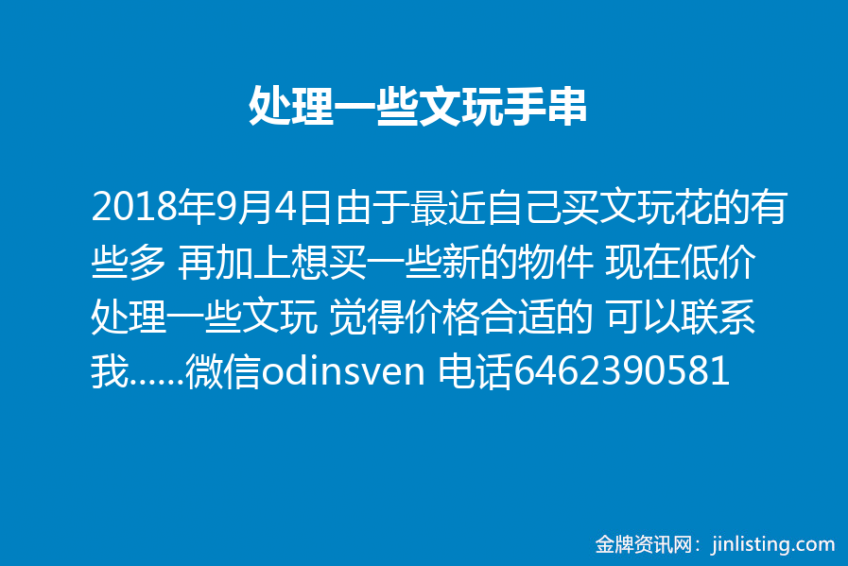 处理一些文玩手串 “由于最近自己买文玩花的有些多 再加上想买一些新的物件 现在低价处理一些文玩 觉得价格合适的 可以联系我 再次声明只赚邮费 现在EMS到纽约首公斤240RMB 只赚这240RMB邮费钱 海黄油梨貔貅把件150刀 紫油梨关公牌子100刀(有小利润)毕竟再便宜就有点过分了 紫油梨蝉(小挂件)50刀 海黄油梨随型标本50刀(花纹不错) 紫檀2.0手持150刀 紫檀0.8佛珠100刀(星很多) 紫檀1.8手串100刀 紫檀1.5竹节手串100刀 火琉璃桶珠50刀 紫檀扇子100刀(扇面是白送的 由于厂家不是专业做扇子的 所以只卖个扇骨钱) 所有东西都保真 纽约地区 全部需要自取 不再刀了 最低价了 再低真的赔钱 喜欢的朋友可加微信odinsven 电话6462390581”