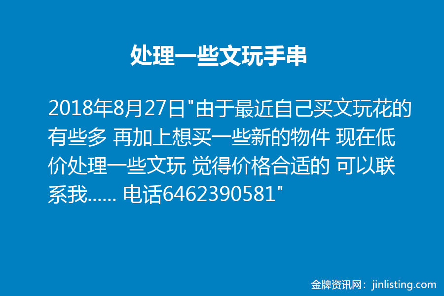 处理一些文玩手串 “由于最近自己买文玩花的有些多 再加上想买一些新的物件 现在低价处理一些文玩 觉得价格合适的 可以联系我 再次声明只赚邮费 现在EMS到纽约首公斤240RMB 只赚这240RMB邮费钱 海黄油梨貔貅把件150刀 紫油梨关公牌子100刀(有小利润)毕竟再便宜就有点过分了 紫油梨蝉(小挂件)50刀 海黄油梨随型标本50刀(花纹不错) 紫檀2.0手持150刀 紫檀0.8佛珠100刀(星很多) 紫檀1.8手串100刀 紫檀1.5竹节手串100刀 火琉璃桶珠50刀 紫檀扇子100刀(扇面是白送的 由于厂家不是专业做扇子的 所以只卖个扇骨钱) 所有东西都保真 纽约地区 全部需要自取 不再刀了 最低价了 再低真的赔钱 喜欢的朋友可加微信odinsven 电话6462390581”