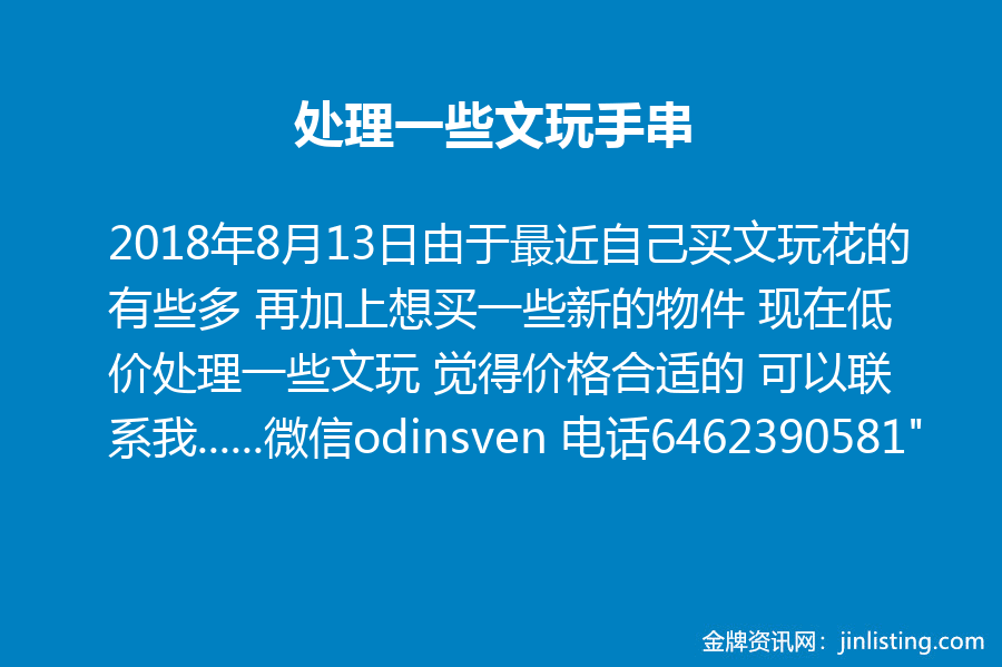 处理一些文玩手串 “由于最近自己买文玩花的有些多 再加上想买一些新的物件 现在低价处理一些文玩 觉得价格合适的 可以联系我 再次声明只赚邮费 现在EMS到纽约首公斤240RMB 只赚这240RMB邮费钱 海黄油梨貔貅把件150刀 紫油梨关公牌子100刀(有小利润)毕竟再便宜就有点过分了 紫油梨蝉(小挂件)50刀 海黄油梨随型标本50刀(花纹不错) 紫檀2.0手持150刀 紫檀0.8佛珠100刀(星很多) 紫檀1.8手串100刀 紫檀1.5竹节手串100刀 火琉璃桶珠50刀 紫檀扇子100刀(扇面是白送的 由于厂家不是专业做扇子的 所以只卖个扇骨钱) 所有东西都保真 纽约地区 全部需要自取 不再刀了 最低价了 再低真的赔钱 喜欢的朋友可加微信odinsven 电话6462390581”