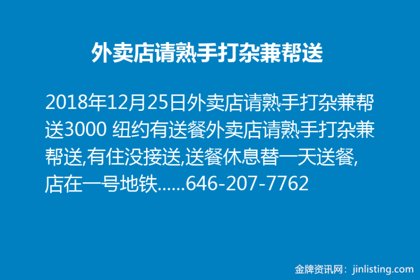 外卖店请熟手打杂兼帮送3000 纽约有送餐外卖店请熟手打杂兼帮送,有住没接送,送餐休息替一天送餐,店在一号地铁最后三四站,唐人街坐地铁一小时到,有意者打电话646-207-7762,工资3000+送餐小费6百多,要有帮送经验,半熟手也可以