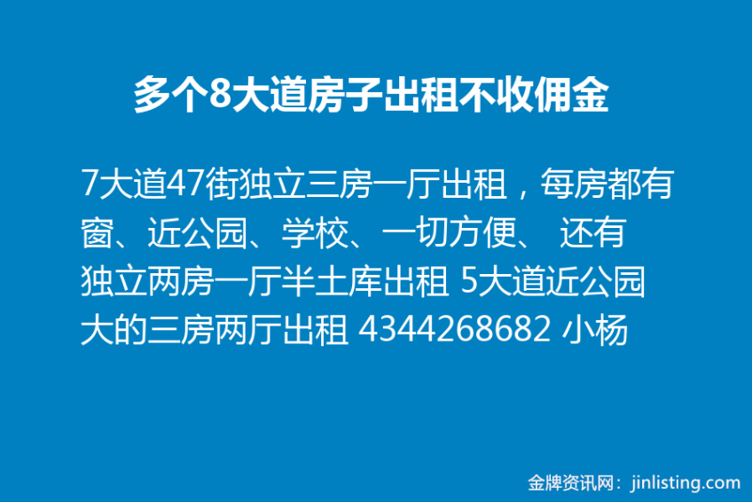 8大道房子出租 7大道47街独立三房一厅出租,每房都有窗、近公园、学校、一切方便、 还有独立两房一厅半土库出租 5大道近公园大的三房两厅出租 4344268682 小杨