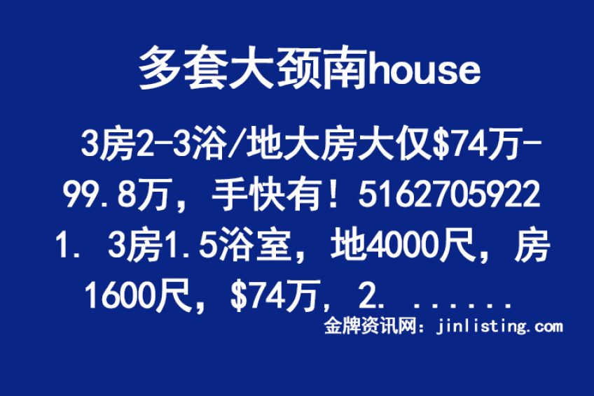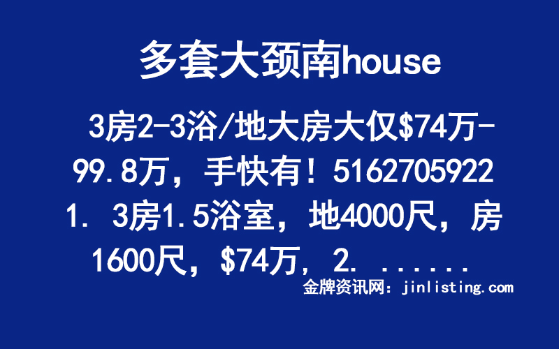 多套大颈南house3房2-3浴/地大房大仅$74万-99.8万,手快有!5162705922 “