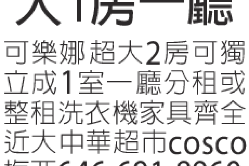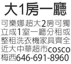 可樂那超大兩房可獨立成兩個一室一廳分租或整租洗衣機家具齊全南北通透大中華超市,cosco,梅西646-691-8960