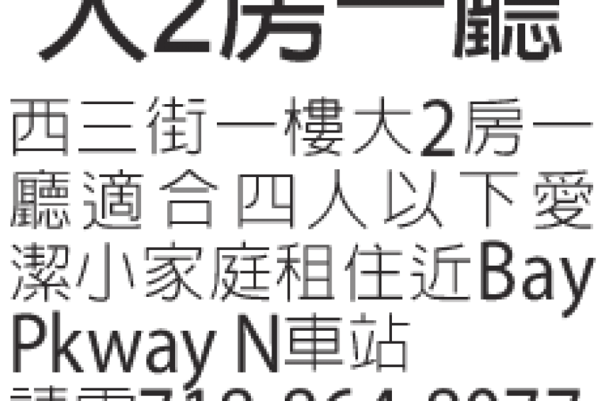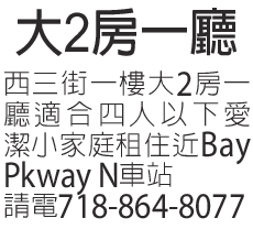 布碌侖西三街一樓,適合四人以下愛潔小家庭租住。近Bay Pkway N車站,有意請電