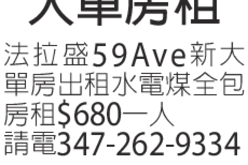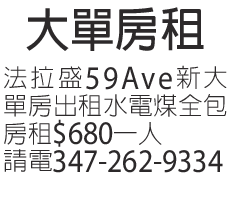 法拉盛59Ave新大單房出租水電煤全包房租$680鹹一人電347-262-9334