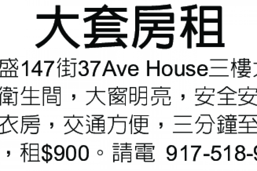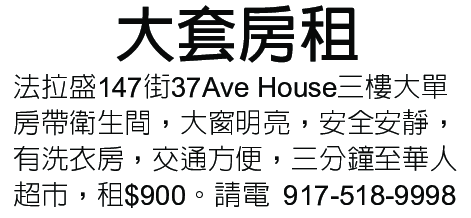 法拉盛147街 37Ave house ,3樓大單房帶衛生間,大窗明亮,安全安靜,有洗衣房,交通方便,三分鐘至華人超市,租$900.