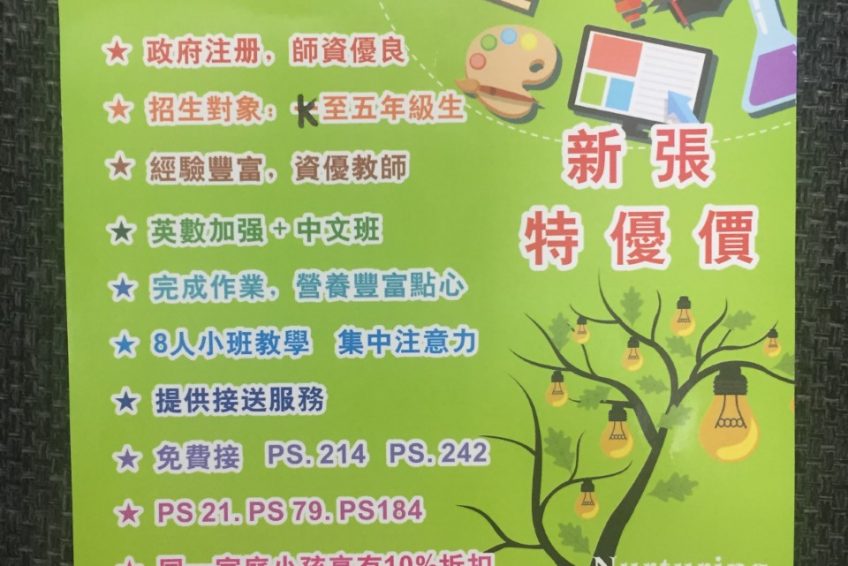 位处北法拉盛的大硕辅导班招生了. 一个月学费$250. 上课时间从下午2:20 Pm 到 6:00 PM . 6:00后延长至 8:30 PM. 无额外小时费用 ! 一次缴一学期 $ 1100. 招收 K 至 五年级 . 老师一对一教导. 完成学校作业. 提升成绩 环境安全舒适.. 八人小班一房. 免费接 PS 214, PS 242 小学. 其他学校校车接 PS 21, PS79, PS184 …. 人数有限. 请尽快报名 ! 电: 718-9098112