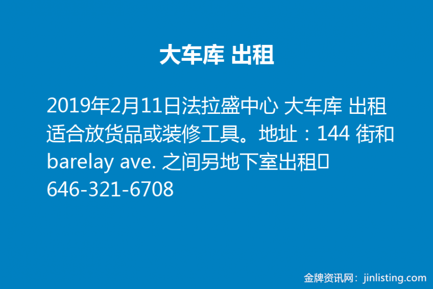 法拉盛中心 大车库 出租适合放货品或装修工具。地址:144 街和barelay ave. 之间另地下室出租☎646-321-6708