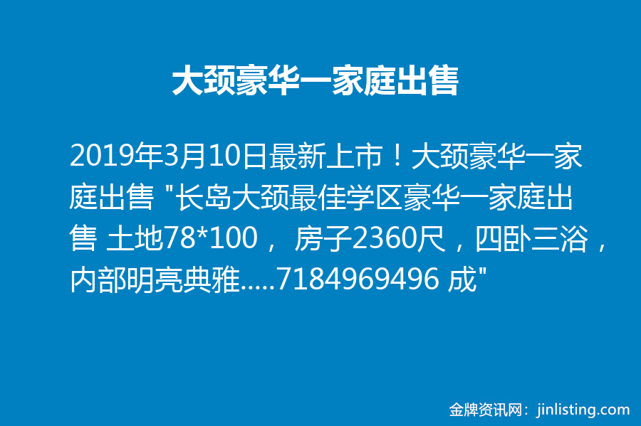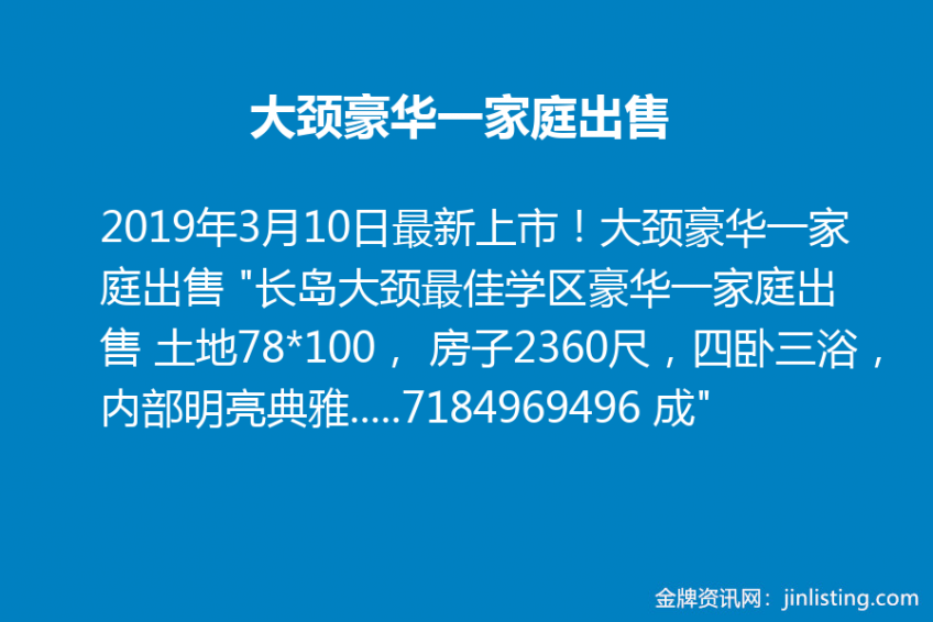 最新上市!大颈豪华一家庭出售 “长岛大颈最佳学区豪华一家庭出售 土地78*100, 房子2360尺,四卧三浴,内部明亮典雅 ,高级装修,实木地板,完整地下室及阁楼,高尚社区环境优雅安静。 售价$118万 地税17851 有意看房请联系:7184969496 成”