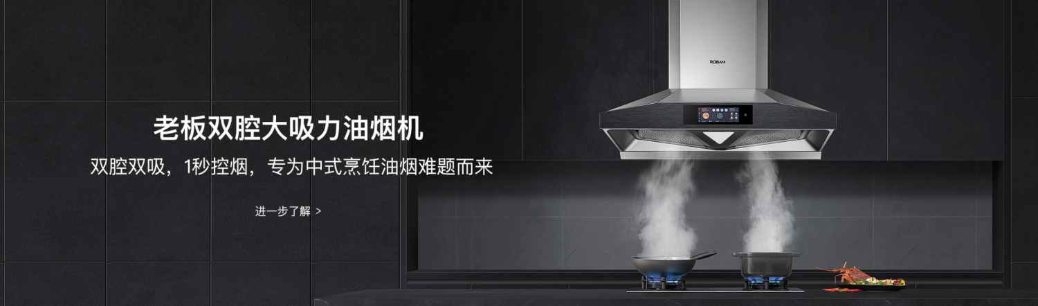 老板电器最新推出的双腔大吸力油烟机,采用最新科技,双腔双吸,实现1秒控烟: