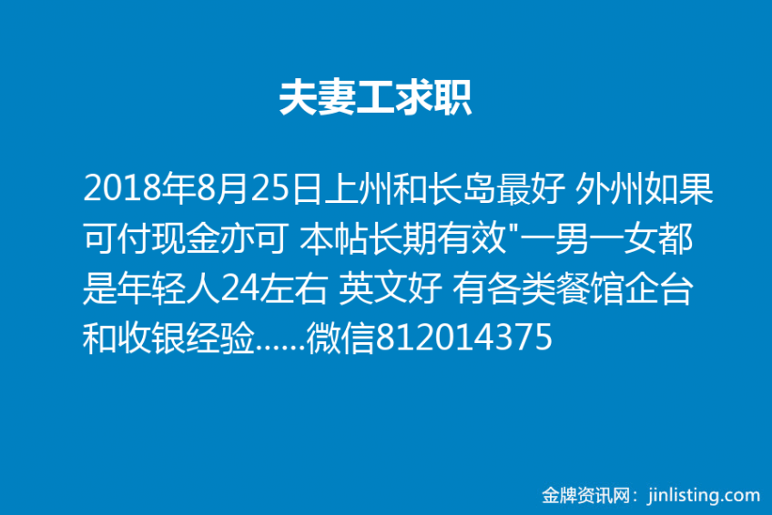 夫妻工求职 上州和长岛最好 外州如果可付现金亦可 本帖长期有效