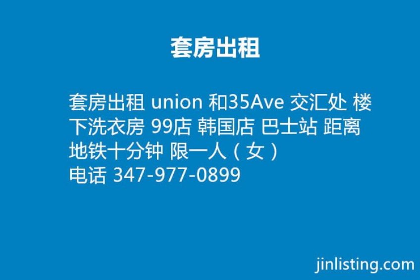 套房出租 union 和35Ave 交汇处 楼下洗衣房 99店 韩国店 巴士站 距离地铁十分钟 限一人(女)电话 347-977-0899