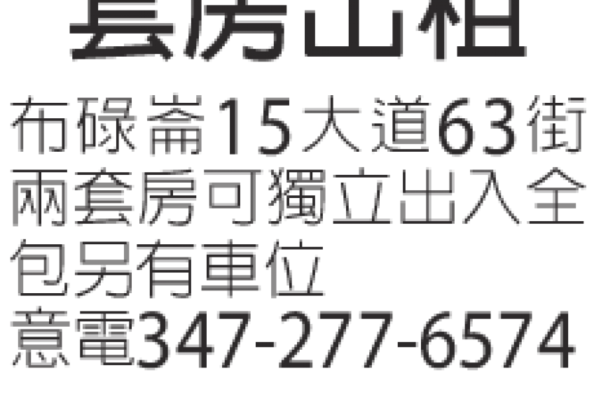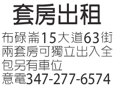 布鲁伦 15大道63行,兩套房可獨立出入全包,另有車位.有意電347-277-6574