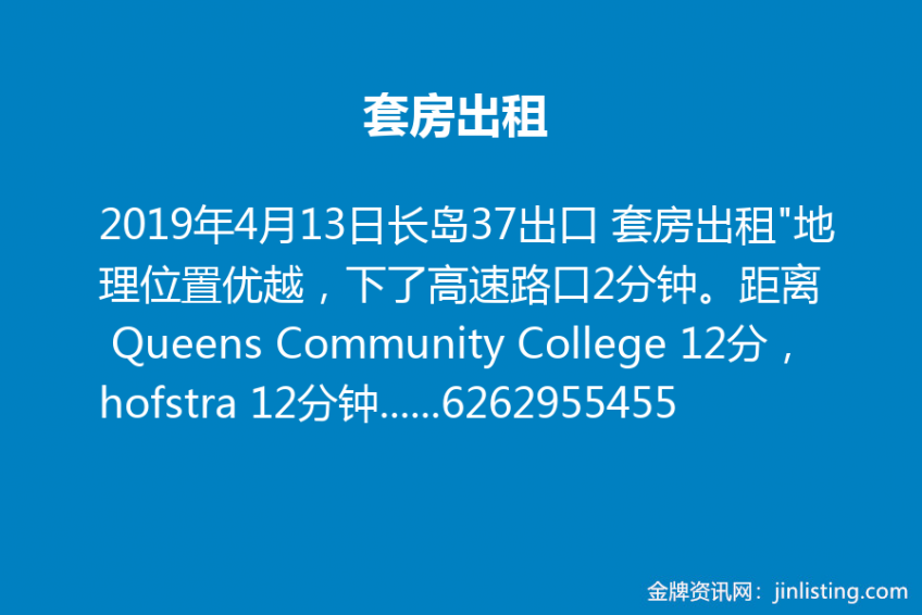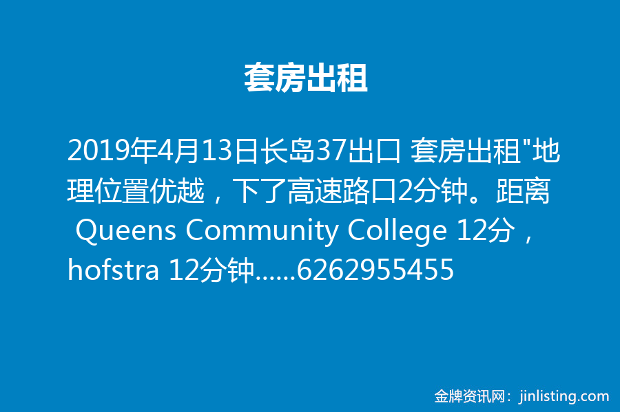 长岛37出口 套房出租 “地理位置优越,下了高速路口2分钟。距离 Queens Community College 12分,hofstra 12分钟,NASSAU community COLLEGE 12分钟。 Garden City 开车10分钟,距离曼哈赛的Americana奢侈品购物中心10分钟,距离38出口的大型shopping mall 也是10分钟,距离中国新飞龙超市, BJ, 沃尔玛,Cosco 都是开车10-12分钟路程。超级方便、 Roslyn 满分学区房 欢迎学生,陪读家庭。5月1日起出租。 联系电话6262955455,联系不上时候请短信。”