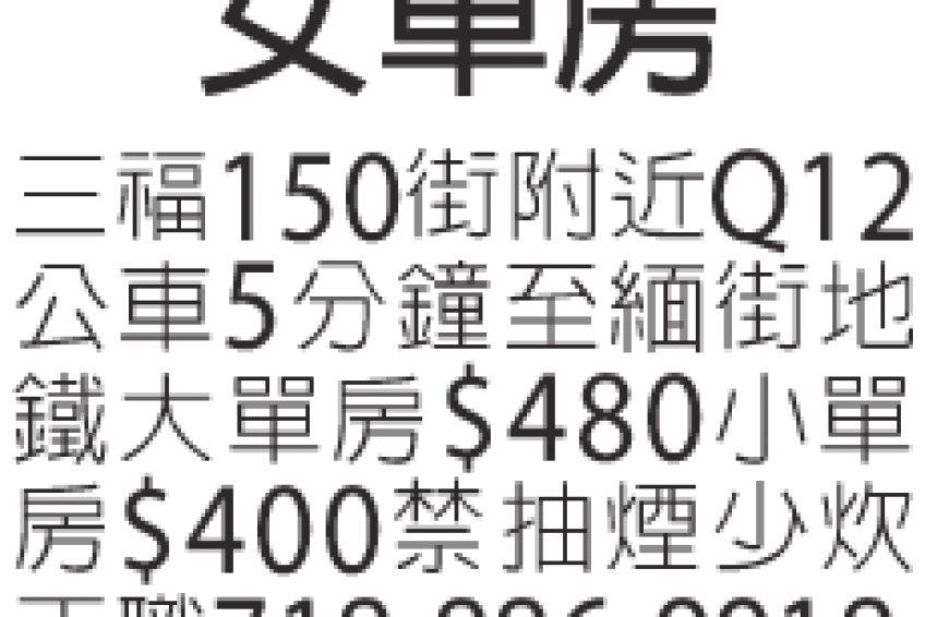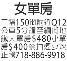 Sanford 150街附近Q12公車5分鐘至緬街地鐵大單房$480小單房$400禁抽煙少炊愛潔正職718-886-9918