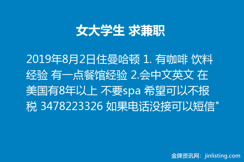 “女大学生 求兼职 住曼哈顿 1. 有咖啡 饮料经验 有一点餐馆经验 2.会中文英文 在美国有8年以上 不要spa 希望可以不报税 3478223326 如果电话没接 可以短信”