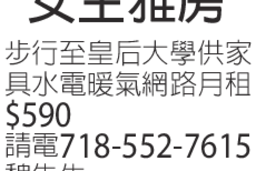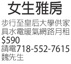 步行至皇后大學,供家具,水電,暖氣,網路,月租$590,請電718-552-7615魏先生。