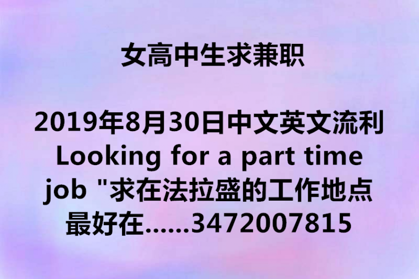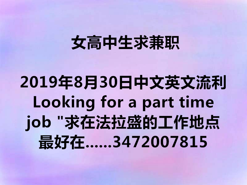 女高中生求兼职 中文英文流利 Looking for a part time job “求在法拉盛的工作地点 最好在4点以后 中文英文流利(在美国快10年) 不报税 学习能力强 最好是和小孩子有关因为非常喜欢小朋友(做过小老师 然后有在补习班帮忙) 请短信联系:3472007815 Looking for a part time job: Currently a high schooler The working place would be best in Flushing Available after 4pm Fluent in Chinese and English No tax Eager to learn It would be the best if the job is about childcare. Had experience of being a teacher and teacher assistance. Used to volunteer at an afterschool Contact (Text Message): 3472007815”