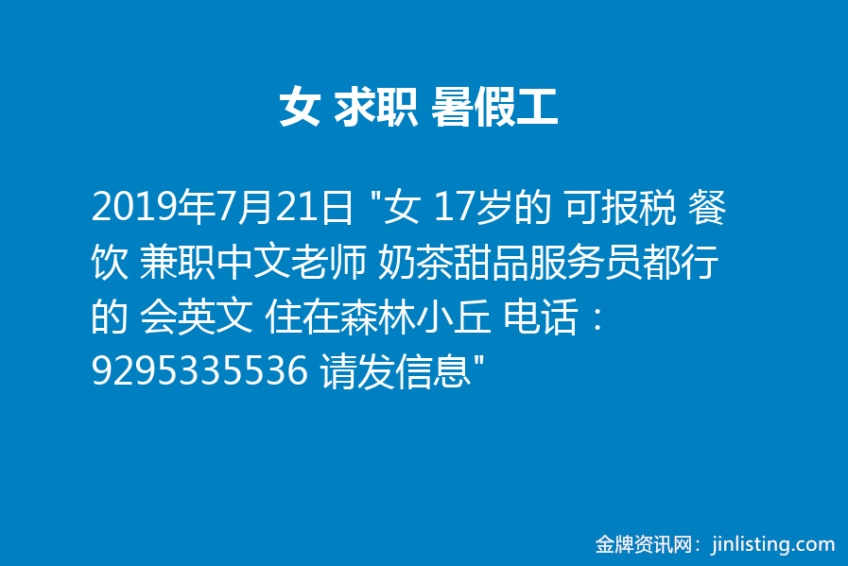 女 求职 暑假工 “女 17岁的 可报税 餐饮 兼职中文老师 奶茶甜品服务员都行的 会英文 住在森林小丘 电话:9295335536 请发信息”