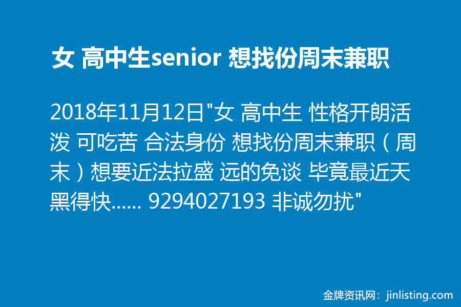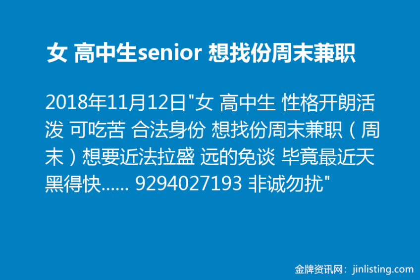 女 高中生senior 想找份周末兼职 近法拉盛929-402-7193
