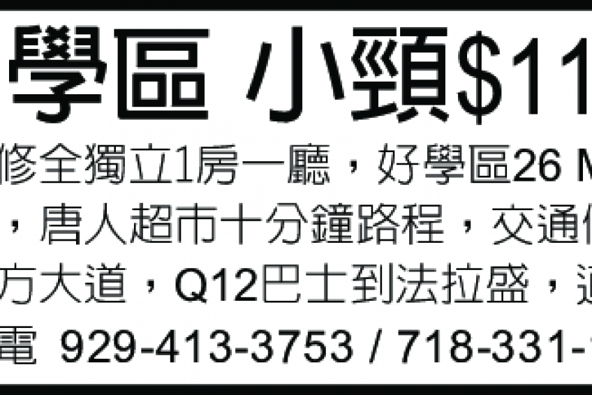新裝修 全独立一房一廳 $1150 非常好学区 26 MS 67 中学 唐人超市十分钟路程 交通方便近北方大道 Q12 巴士到法拉盛 适合一或两人。