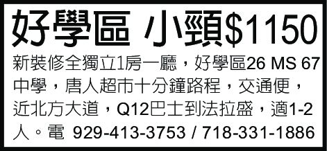 新裝修 全独立一房一廳 非常好学区 26 MS 67 中学 唐人超市十分钟路程 交通方便近北方大道 Q12 巴士到法拉盛 适合一或两人。