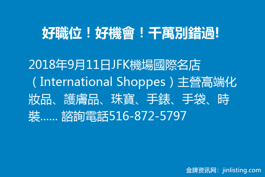 JFK機場國際名店(International Shoppes)主營高端化妝品、護膚品、珠寶、手錶、手袋、時裝、名酒、菸草、糖果及各類名牌產品。現正招聘多名銷售人員、客戶服務員、鐘錶珠寶銷售助理、美容顧問、主管、存儲送貨工人、清潔工人、銷售培訓師、及信差等。待遇優厚、公司正規、有專員培訓,是提升、融入主流社會的好機會。 有意者請電郵簡歷至pcheng@ishoppes.com。 諮詢電話516-872-5797 轉120 鄭先生。
