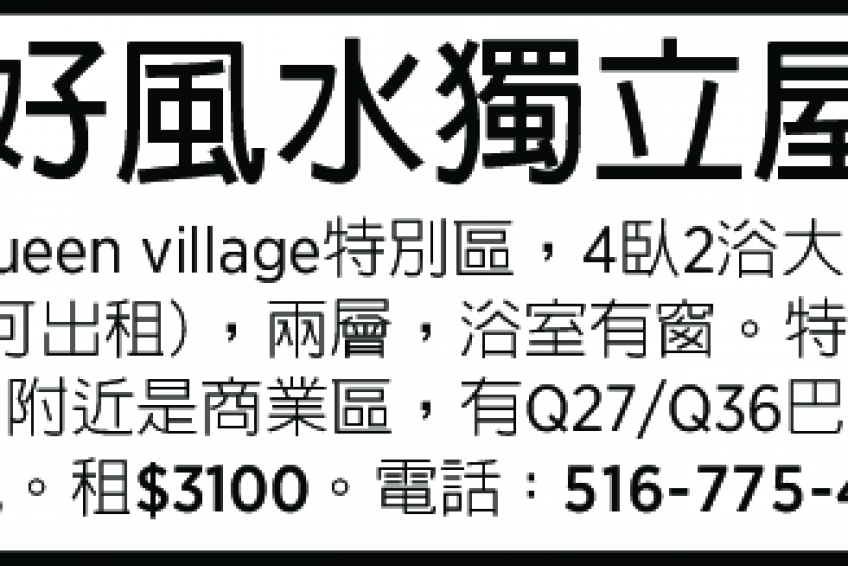 特好學區,附近是商業區,有Q27Q36巴士和F地鐵。租$3100。