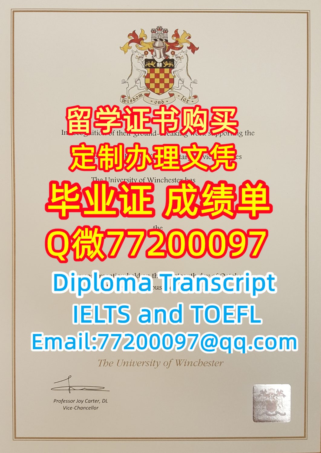 学历学位认证Winchester文凭证书做温切斯特大学毕业证成绩单Q微77200097有Winchester学位证书精仿Winchester毕业证书能办Winchester成绩单制作温切斯特大学文凭证书雅思托福The Uniiversity of Winchester Diploma Degree Transcript