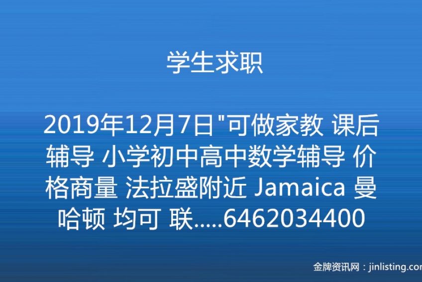 学生求职 “可做家教 课后辅导 小学初中高中数学辅导 价格商量 法拉盛附近 Jamaica 曼哈顿 均可 联系方式:vx:LOVE_Xenia_ 电话:6462034400(请短信)”