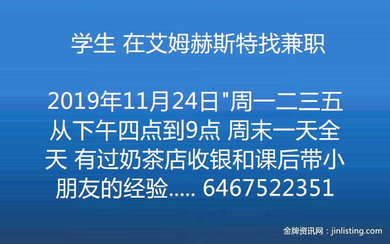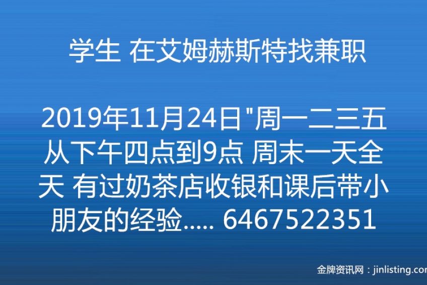 学生 在艾姆赫斯特找兼职 “周一二三五从下午四点到9点 周末一天全天 有过奶茶店收银和课后带小朋友的经验 在校学生 6467522351谢谢”