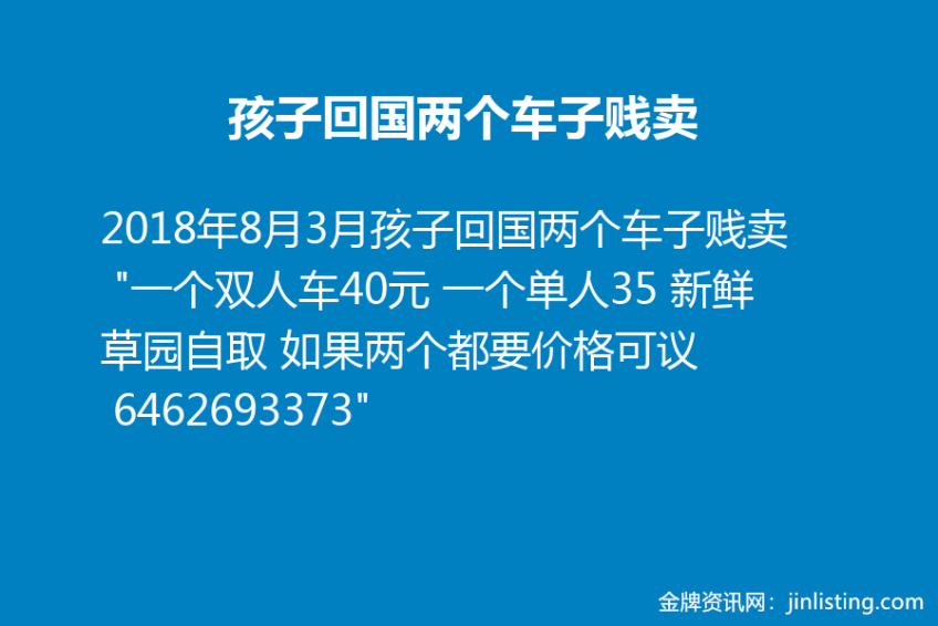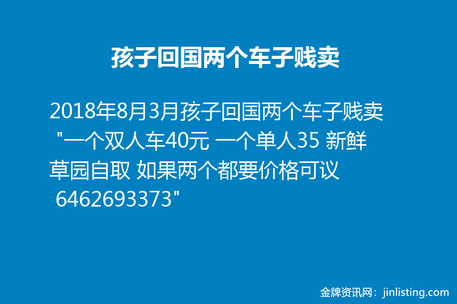 孩子回国两个车子贱卖 “一个双人车40元 一个单人35 新鲜草园自取 如果两个都要价格可议 6462693373”