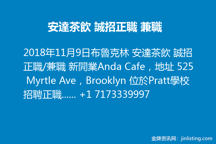 布魯克林 安達茶飲 誠招正職/兼職 新開業Anda Cafe, 地址 525 Myrtle Ave,Brooklyn 位於Pratt學校 招聘正職/兼職人員 最好有飲品店工作經驗 需要熱情待客 有意向請電聯 +1 7173339997 李生 郵件 jinhangli87@gmail.com