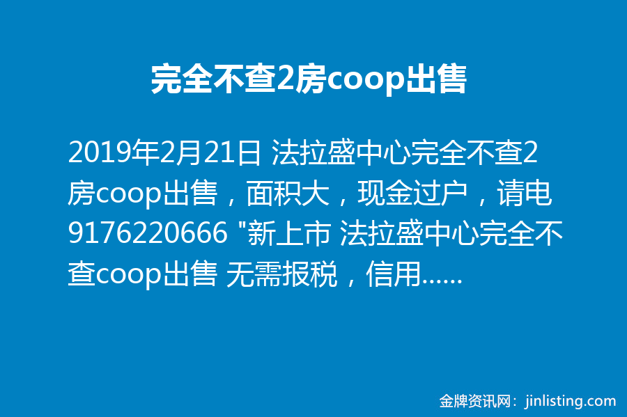 法拉盛中心完全不查2房coop出售,面积大,现金过户,请电9176220666~~ “新上市 法拉盛中心完全不查coop出售 无需报税,信用,面试,买来即可出租 面积1000尺,无需装修 管理费$891(除电,煮饭煤气不包) 全现金过户”