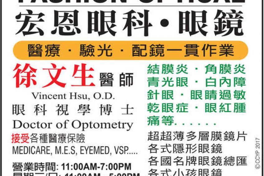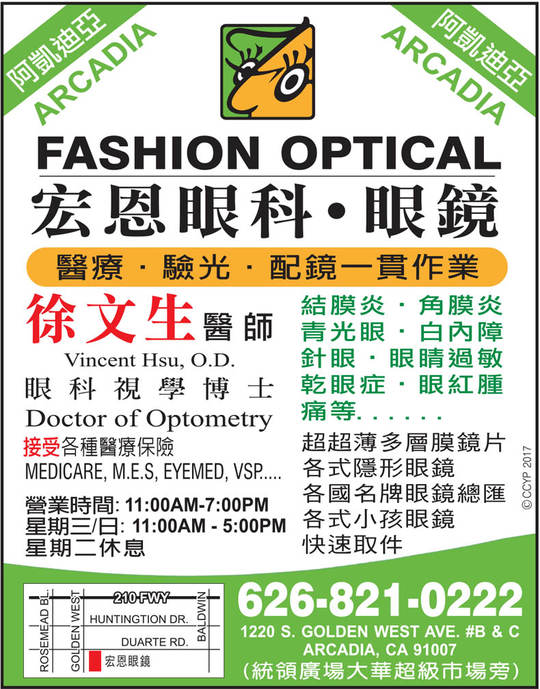 宏恩眼科·眼鏡 – Fashion Optical 眼科 (626) 821-0222 簡單介紹 醫療丶驗光丶配鏡壹貫作業。結膜炎丶角膜炎丶青光眼丶白內障丶針眼丶眼睛過敏丶幹眼癥丶眼紅腫痛等。 MON,WED-SAT(11-7); SUN(11-5)