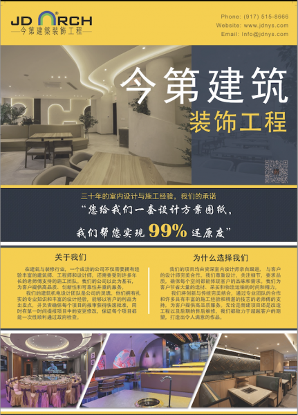 今第建筑成立于2013年,是一个设计建造团队,包括设在纽约的两家公司:JD Arch LLC和JD Design AssociatesInc。我们的服务专注于建筑、机械、电气和水暖设计,例如商业场所的室内装修和施工管理,例如指甲沙龙,水疗中心,办公室和餐厅。