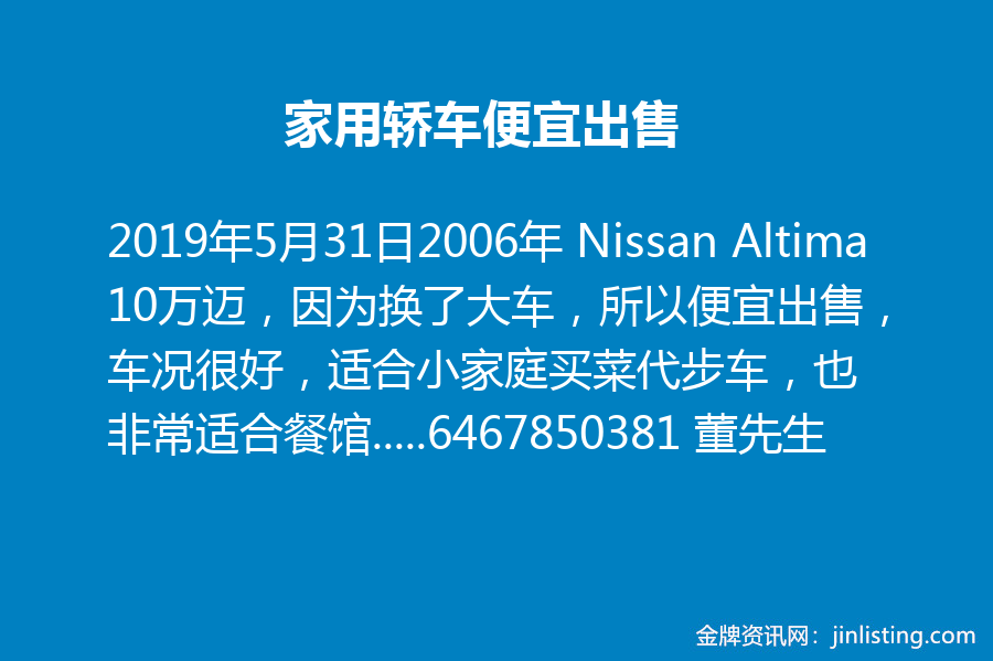 家用轿车便宜出售 2006年 Nissan Altima 10万迈,因为换了大车,所以便宜出售,车况很好,适合小家庭买菜代步车,也非常适合餐馆送餐非常省油。需要的可以联系,车在新鲜草原,电话6467850381 董先生