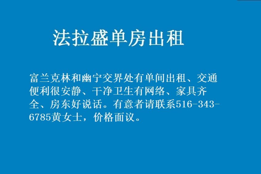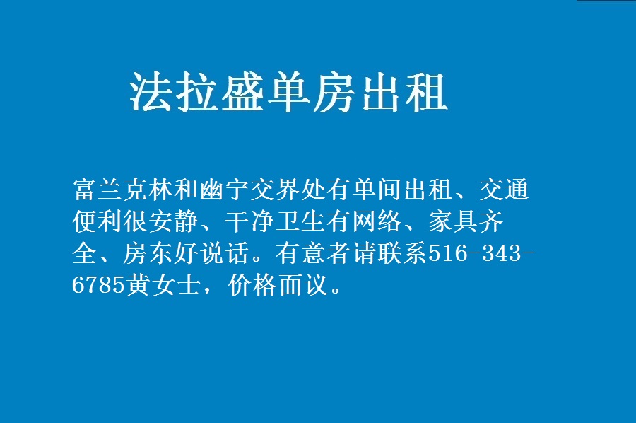 富兰克林和幽宁交界处有单间出租、交通便利很安静、干净卫生有网络、家具齐全、房东好说话。有意者请联系516-343-6785黄女士,价格面议。