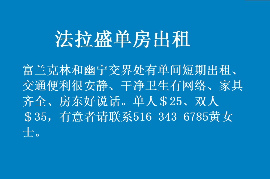富兰克林和幽宁交界处有单间短期出租、交通便利很安静、干净卫生有网络、家具齐全、房东好说话。单人$25、双人$35,有意者请联系516-343-6785黄女士。