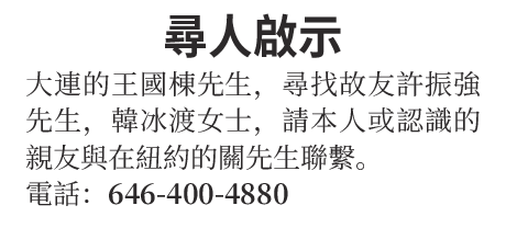 大连的王国栋先生,寻找故友许振强先生, 韩冰渡女士, 请本人或认识的亲友与在纽约的关先生联系 。