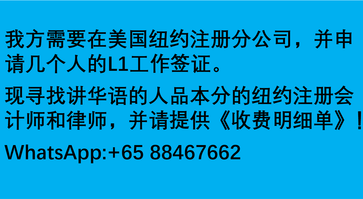 现寻找讲华语的人品本分的纽约注册会 计师和律师,并请提供《收费明细单》! WhatsApp:+65 88467662