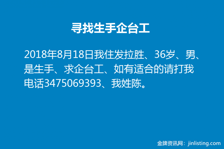 我住发拉胜、36岁、男、是生手、求企台工、如有适合的请打我电话3475069393、我姓陈。