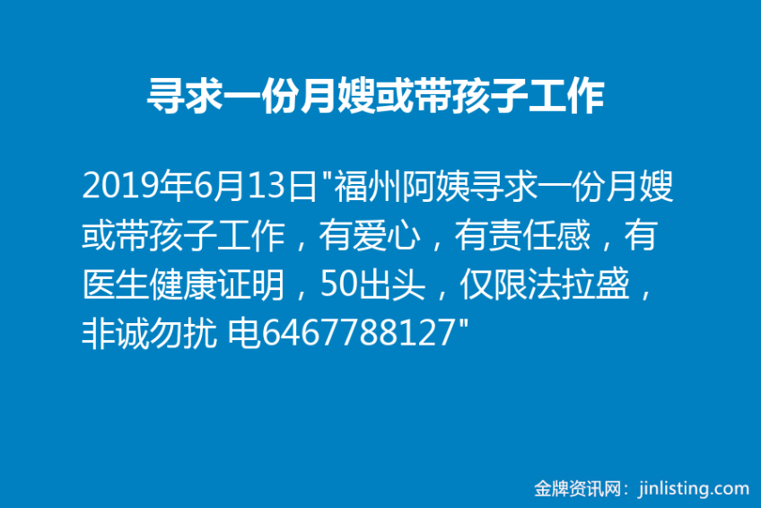 “福州阿姨寻求一份月嫂或带孩子工作,有爱心,有责任感,,有医生健康证明,50出头,仅限法拉盛,非诚勿扰 电6467788127”