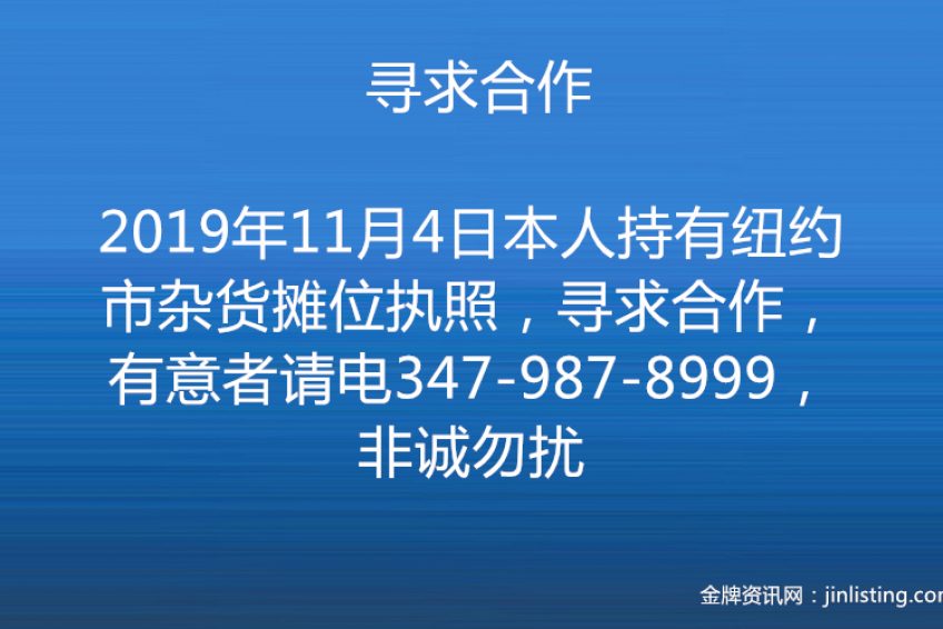 本人持有纽约市杂货摊位执照,寻求合作,有意者请电347-987-8999,非诚勿扰