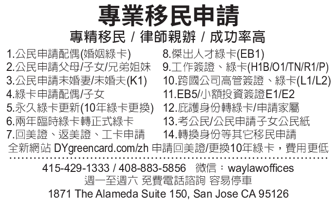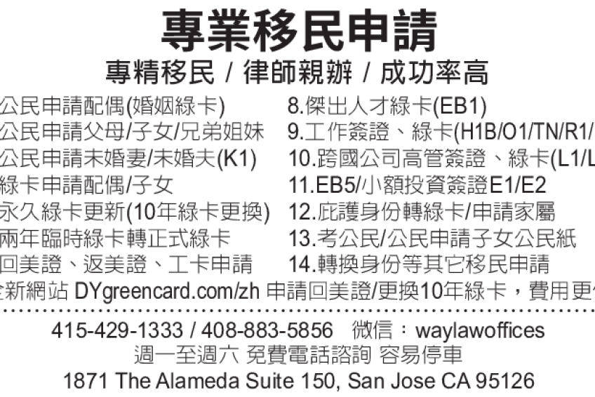 專業移民申請 專精移民/律師親辦/成功率高 415-429-1333 408-883-5856