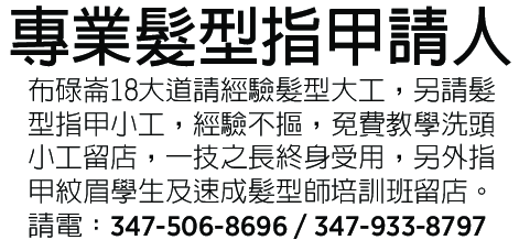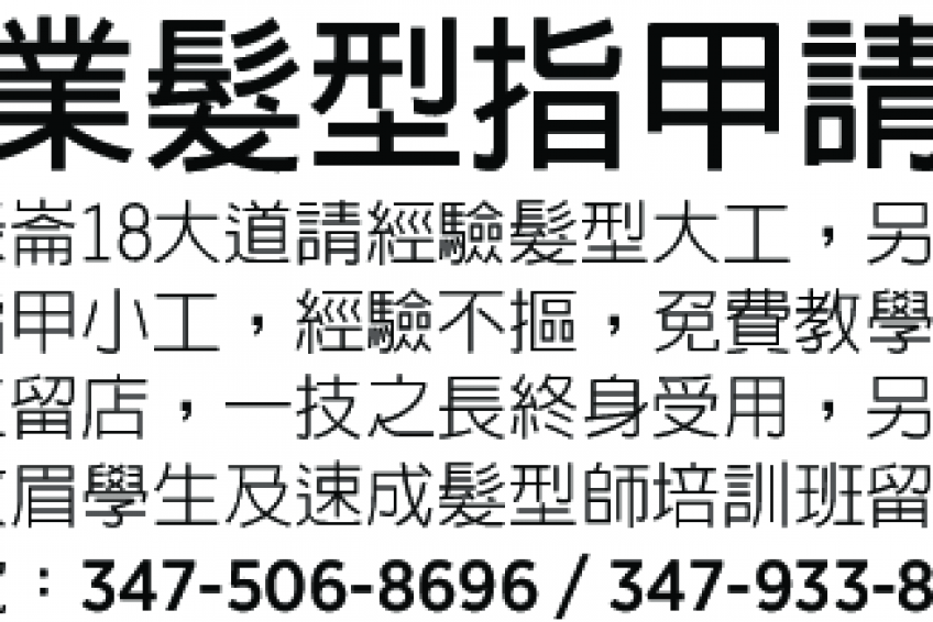 布魯倫18大道請經驗髮型大工,另請髮型指甲小工,經驗不摳,免費敎學洗頭小工留店,一技之長終身受用,另外指甲紋眉學生及速成髮型師培訓班留店電347-506-8696