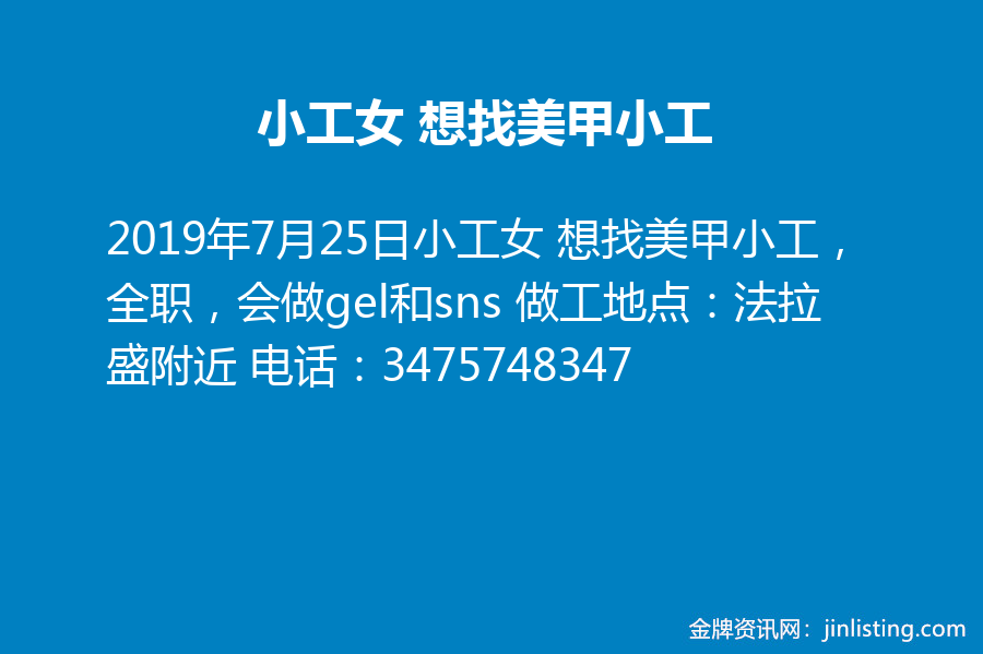小工女 想找美甲小工,全职,会做gel和sns 做工地点:法拉盛附近 电话:3475748347