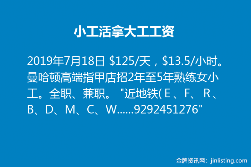小工活拿大工工资,$125/天,$13.5/小时。曼哈顿高端指甲店招2年至5年熟练女小工。全职、兼职。 “近地铁(E、F、R、B、D、M、C、W), 薪水高,全职$13.5/小时,兼职$12/小时 over time $16.95/小时 日薪 $125/天。 收费高(普通手脚$70),高端客人,小费非常好! 上班时间10:50am—8:30pm 下班准时,不拖工 电话:9292451276”