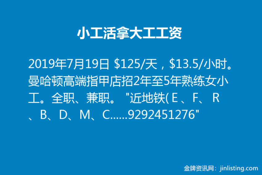 小工活拿大工工资,$125/天,$13.5/小时。曼哈顿高端指甲店招2年至5年熟练女小工。全职、兼职。 “近地铁(E、F、R、B、D、M、C、W), 薪水高,全职$13.5/小时,兼职$12/小时 over time $16.95/小时 日薪 $125/天。 收费高(普通手脚$70),高端客人,小费非常好! 上班时间10:50am—8:30pm 下班准时,不拖工 电话:9292451276”